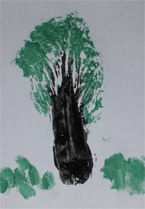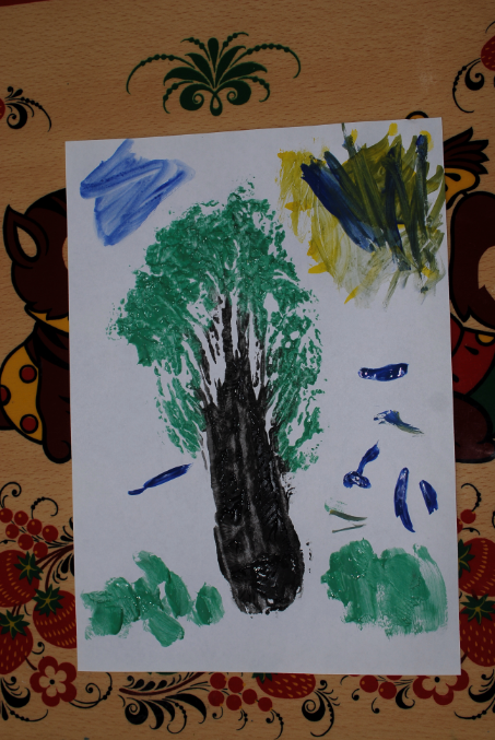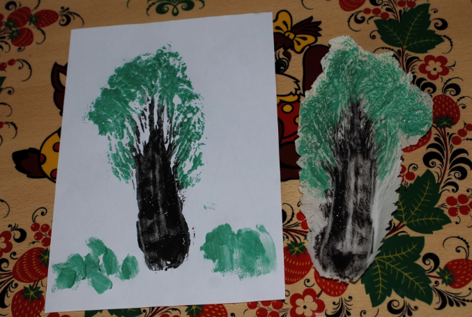 Смешала зубную пасту с гуашью, взяли лист китайской капусты и вместе с ребенком нанесли кисточкой краску на лист капусты. Потом аккуратно перевернули на чистый альбомный лист: