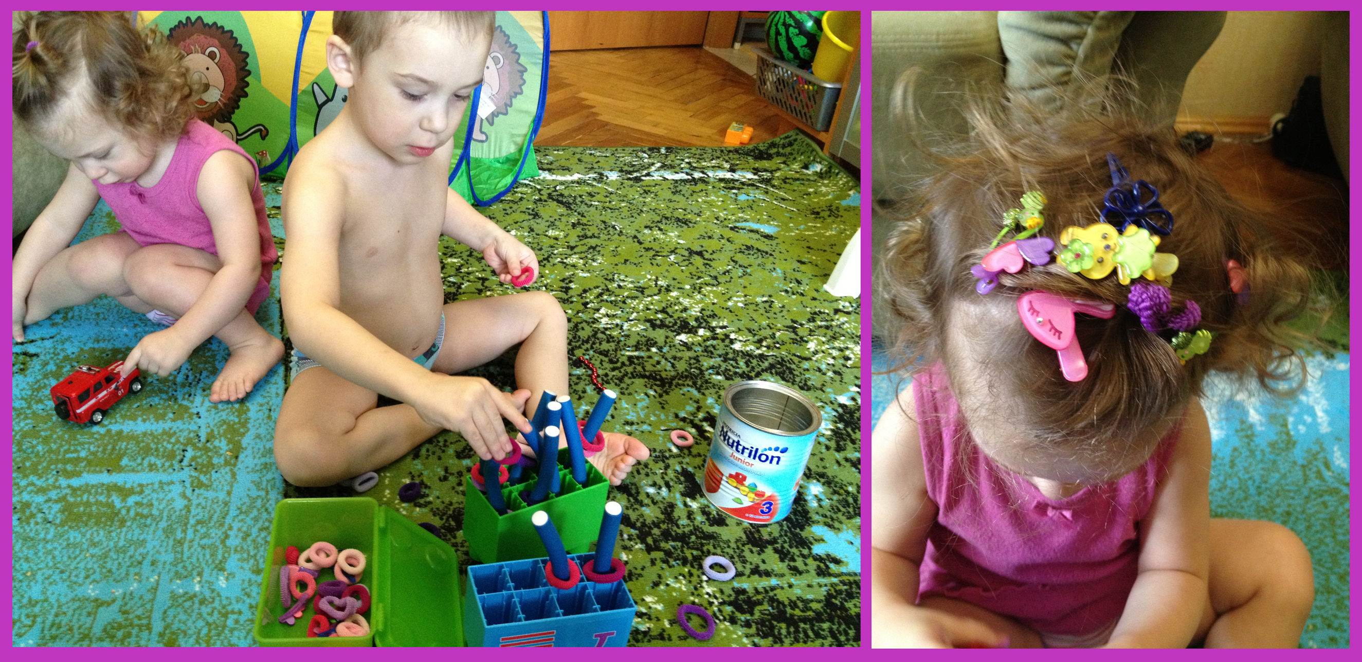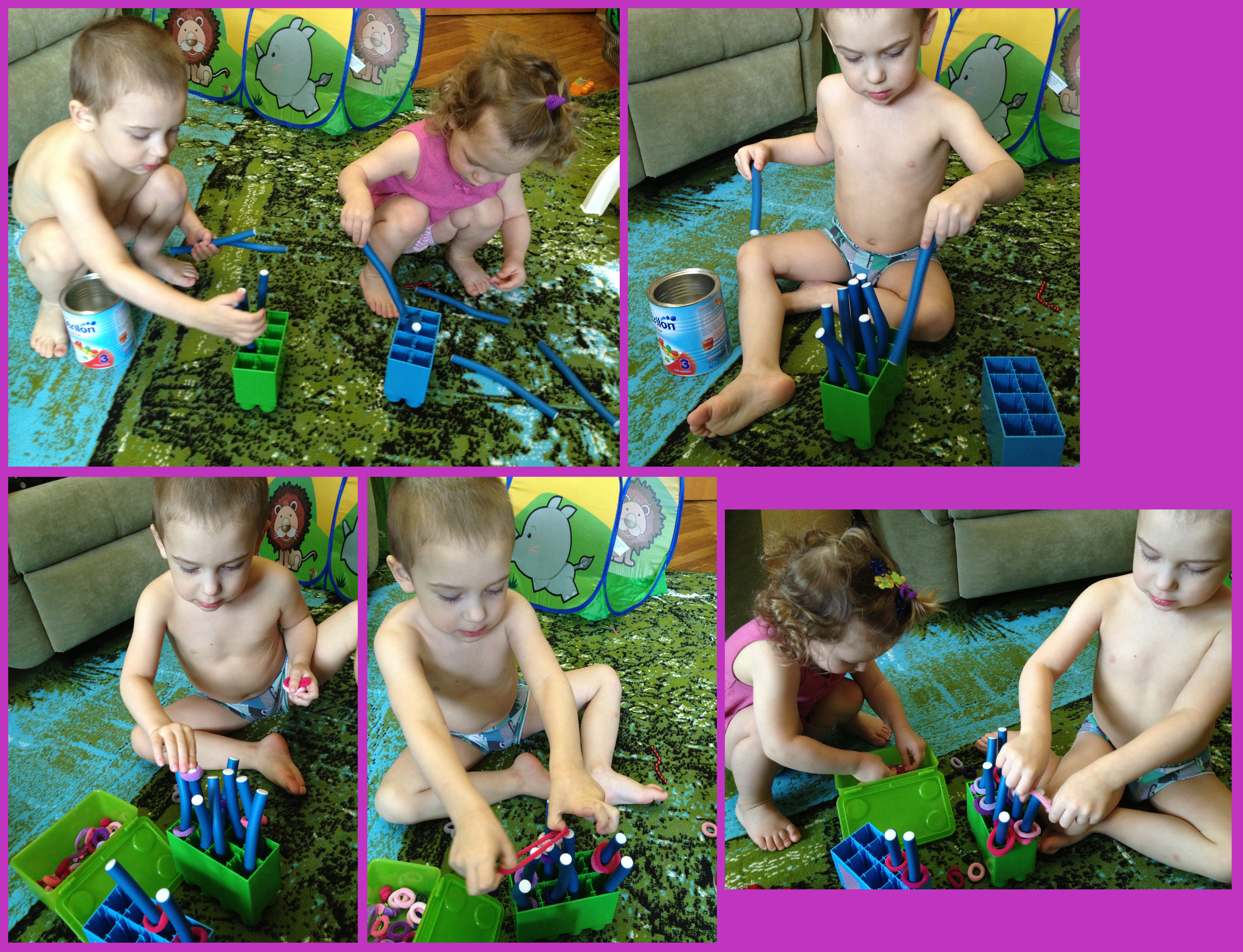 Задание второе - надеть на бигудюшки резиночки. Бигуди легко гнутся - задание осложняется. (Благодаря гибкости бигуди, думаю, что можно придумать с ними еще много игрушек))