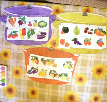 кастрюли распечатала и раскрасила, Карточки с продуктами на чб принтере не получились по этому я на них наклеила наклейки!