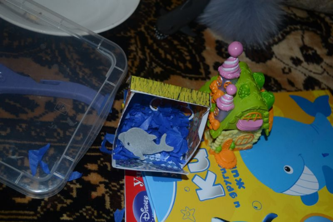 Вот такой у нас был аквариум, я наполнитель нарезала из бумаги, и каждый день у нас появлялся новый морской житель