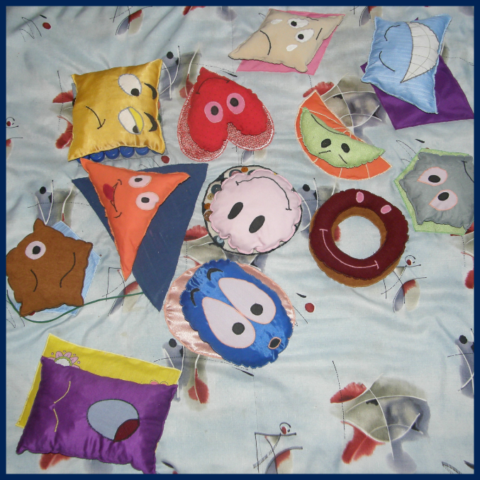 Коврик получился квадратный, подкладка из синтипона, с двух углов оставила место, чтобы можно было посидет и поиграть с ним. Сами фигуры наполнила различным материалом: горохом, фасолью, кукурузной крупой, фундуком, каштанами, морскими камешками,крышечками от банок для детского питания, старыми ручками, нашила пуговички, пробки от бутылок, одну вышила бисером. А так как у нас нереальная любовь к всяким разным лялям, получился еще и комплектик геометрических подушечек-смайликов с разными эмоциями, по крайней мере, постаралась как-то их изобразить.