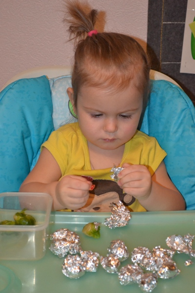 Тренировали наши пальчики, разворачивали из фольги брюссельскую капусту.