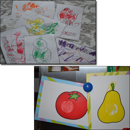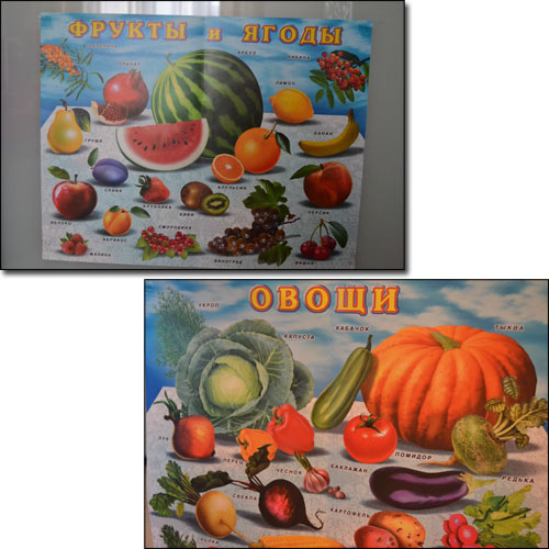 На стенах, как обычно, развесили плакаты. Плакаты взяла из вот этих пособий: Фрукты, овощи. Помимо плакатов, там есть еще лото и раскраски (фото ниже).