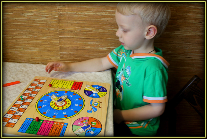 А затем достали наш календарь, на котором отмечаем, (когда вспоминаем) число, месяц, соответствующий день недели...Там тоже с часами побаловались.