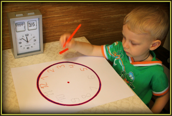 Далее мы приступили созданию своих часов. Обводили цифры,заодно запоминая, какая как пишется и рисовали потом у них стрелки, указывающие то время, какое захотел Андрюшка.