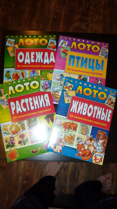 2. Лото "Хатбер": Птицы, растения, животные, оджеда. Очень красочные и приятные картинки, один минус -картон тонковат- придется укрепить, что-то более плотное подклеить.