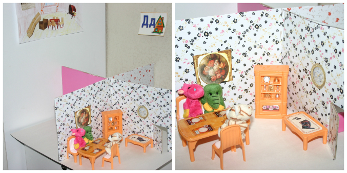 Домики сменились на вот такую квартиру. Сделала из 2х прямоугольных картонок,обклеила клеющейся бумагой.Получилось 4 комнаты-ванна,спальня,гостинная,кухня. Есть у нас игрушечная мебель.Играли.