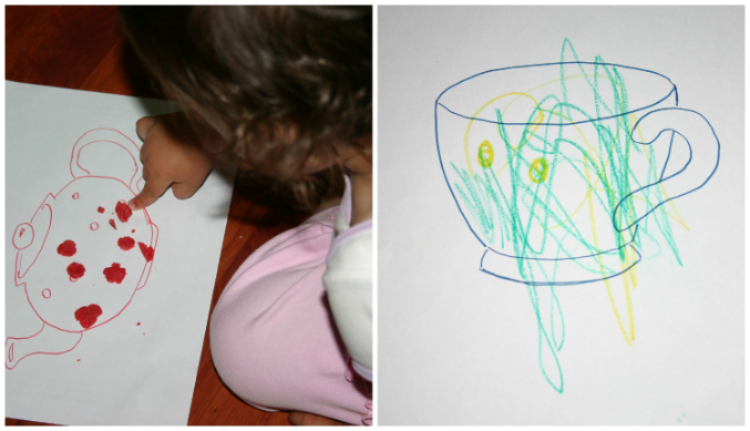 Чайнику лепили кружочки.Раскрашивали посуду.