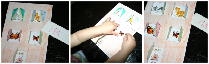 Играли вот с таким домиком. Открывали окошки,там у нас один котик и 2,большая бабочка и маленькая. Также можно втавлять картонку,менять картинки в окошках. Считали окошки и этажи.
