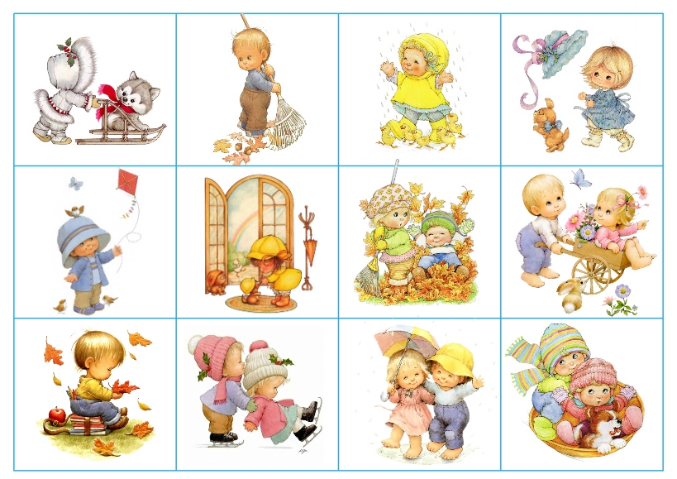3. Карточки "Погода и времена года". Планирую обсуждать что нарисовано на картинке и к какому времени года относится (сортировка по сезонам). Каждому времени года соответствуют 3 картинки. Попробуйте угадать какие?