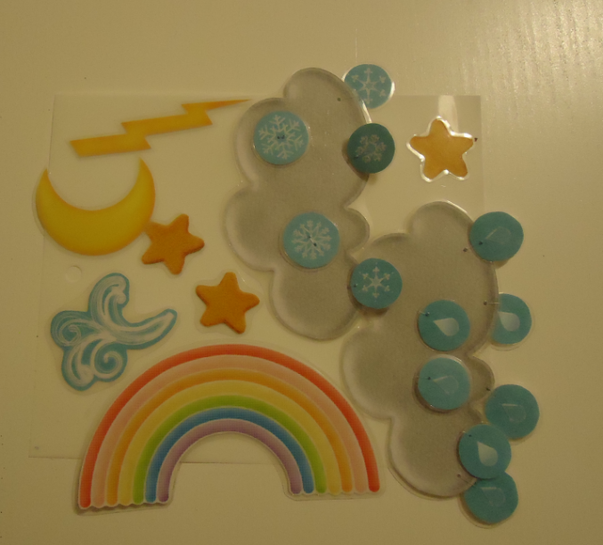 Погоду нужно менять на синем прямоугольнике, все элементы заламинированы и посажены на двусторонний скотч, те которые не используются висят рядом на бумажке от наклеек, работают как многоразовые наклейки. Снег и капельки дождя я пришивала к тучам с помощью все той же лески. Кстати, завитки это ветер.