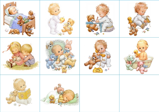 5. Карточки " Распорядок дня" : сначала будем озвучивать что нарисовано (действие: проснулся, играет, моется и т.д.), потом раскладывать последовательность: проснулся, поел, оделся, гуляет... Еще буду называть время суток: утро, день, вечер, ночь.