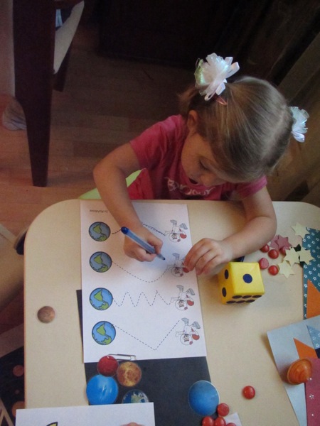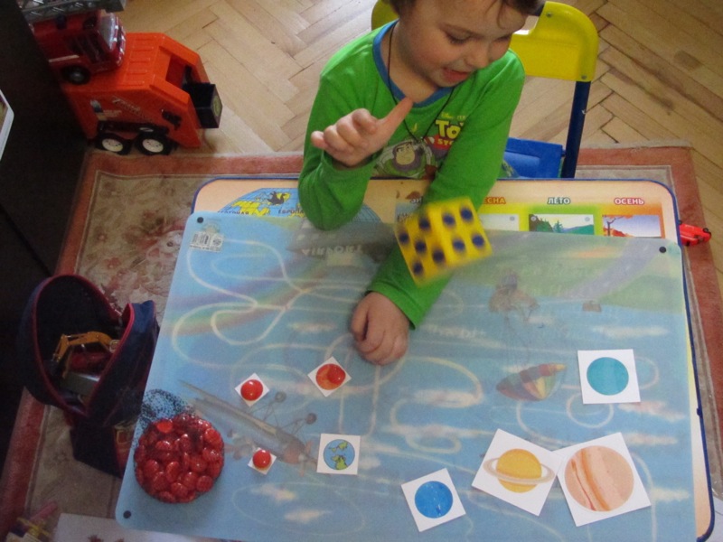 на кубик наклеила кружочки из бархатной бумаги, как на игральном кубике. Разложила планеты. Бросаем кубик и узнаем сколько космических шатлов отправиться на эту планету. В роли космических кораблей стеклянные шарики