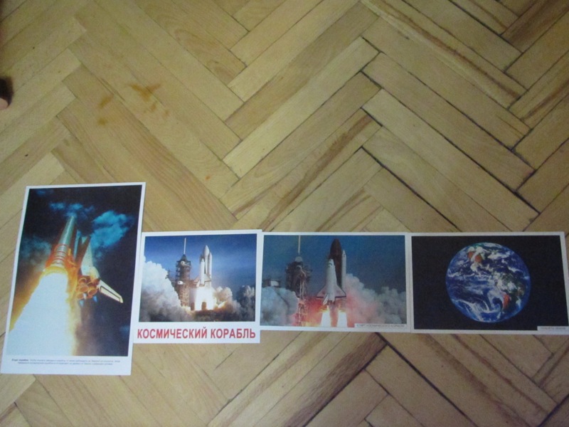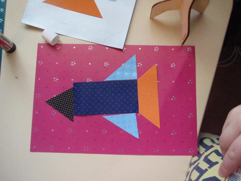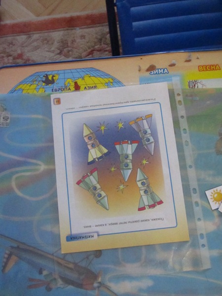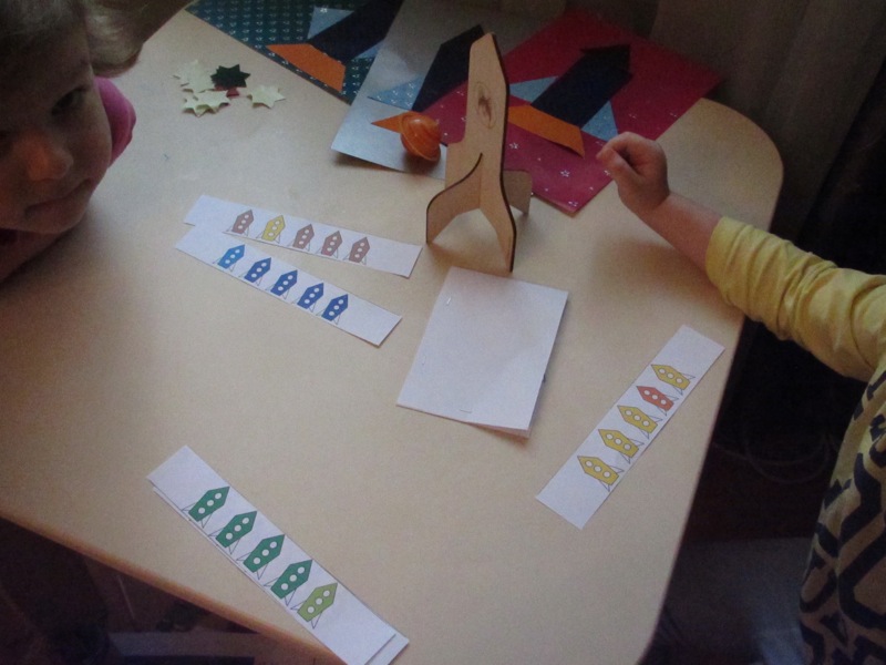 Сначала были показаны ракеты с цифрами и надо было приклеить столько же звездочек (самоклейка из цветной бумаги)