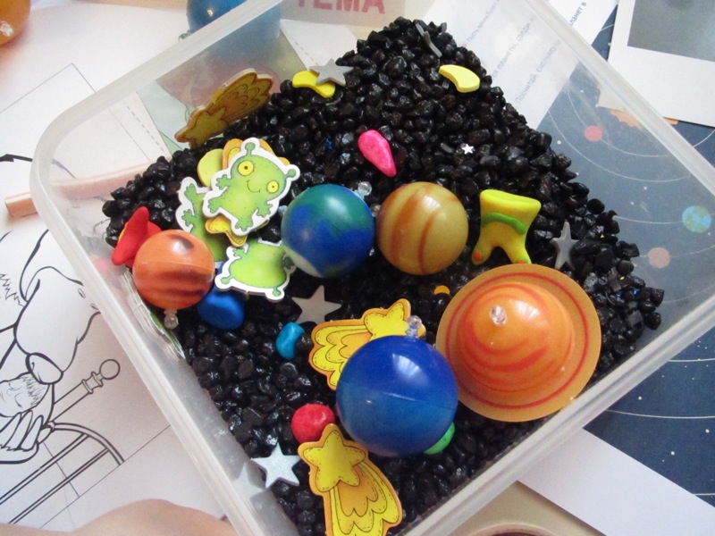 Наполнение коробочки из набора Fox in the box http://www.babyblog.ru/user/Suvimaca/3040105 плюс я добавила туда модели планет, который купила в Imaginarium и счетный материал (зеленые человечки и кометы) из и И играя с атктильной коробкой, мы все равно повторяли счет, у кого больше, у кого меньше, задания возьми три кометы и убери одну из них сколько же осталось комет, ну в общем все вокруг одной коробочки, а вариантов то очень много! Со Степкой мы потом еще и дорожки строили из человечков зеленых (длинная/короткая)