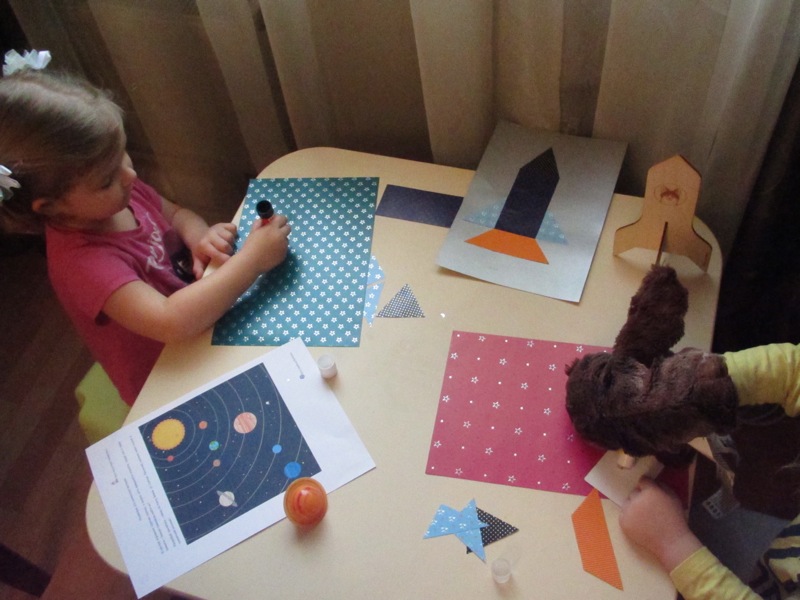 Дальше когда дети немножко пришли в себя, но все равно заниматься не хотели, я дала им задание-творчество. Сделать апликацию "Ракета" по образцу.