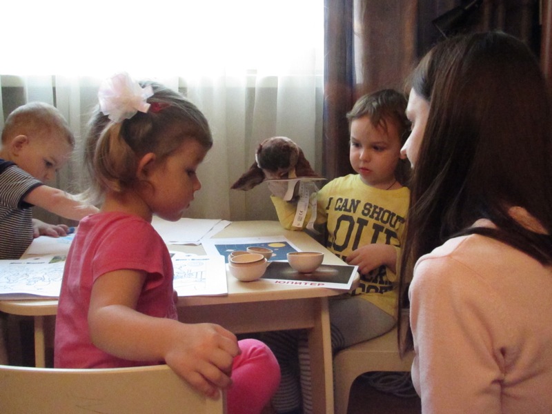 По плану: В начале занятий прилетает наша тетушка сова на ракете и в подарок для деток привозит и дальше следует рассказ о космосе, о том что атм летают ракеты, а шар потому что наша Земля имеет форму шара и так дале и так далее... На деле: Степа выхватывает ракету с совой, и говорит, что летать будет он, Даша выхватывает шар и начинает его разбирать)))))) А шар кстати, у нас не простой, это шар -матрешка, в нем еще 5 шаров. Но зато получилось поговорить о том, что есть планеты очень большие, например Юпитер, он как самый большой шар может вместить в себя несколько планет, а есть планеты совсем маленький, Меркурий например, он вот такой как самый маленький шарик.