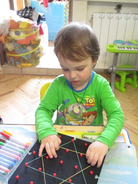 Планшет представляет из себя квадрат с гвоздиками на которых можно натягивать резинки (банковские) и делать разные геометрические фигуры, цифры, буквы. Я как-нибудь напишу о нем отдельный пост и сфоткаю инструкцию к нему для наглядности, чтобы было более понятно!