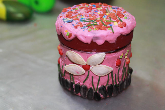 нам потребовались пластилин, баночка, крашенная крупа и фантазия.