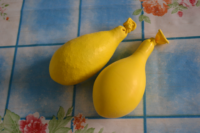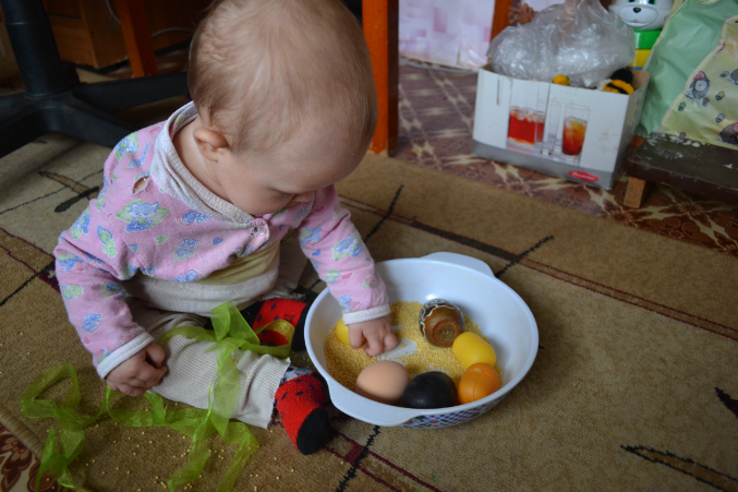 Еще играли с цыпленком с пищалкой внутри, с воздушными шариками, наполненными мукой и пшеном, мяли их ручками, запоминали желтый цвет.