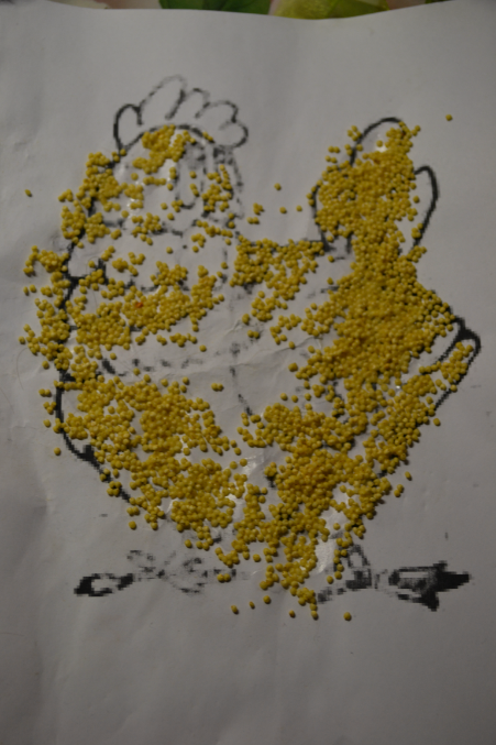 Позанимались творчеством. Сделали аппликацию из пшена. Конечно, с помощью мамы. Я показывала как сыпать, но Роксане больше нравилось размазывать липкое пшено по бумаге туда - сюда (на будущее - печатать на более плотной бумаге или на картоне, чуть было не порвали основу) В итоге получилось вот что: (фотографировала уже ночью)