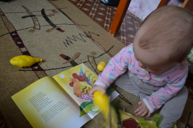 Играли в "где цыпа-цыпа", трогали пуговки, пытались сказать "Ко-ко" и "Пи-пи", у Роксаны получалось только редкое удивленное "Ку?"