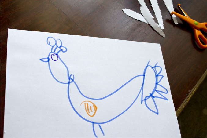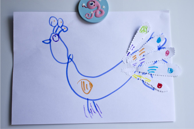 Плюша нарисовала павлина, я вырезала перья для хвоста. Плюша приклеили их и раскрасила