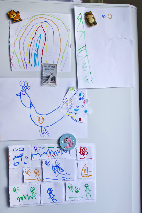 Мистер Умелец или Очумелые ручки (поделки, аппликации, интересные находки, идеи и задумки)Мы с Плюшей устраиваем выставку наших работ для папы. Крепим их к холодильнику магнитами, а вечером, когда папа приходит с работы, хвастаемся. Сегодня у нас так.