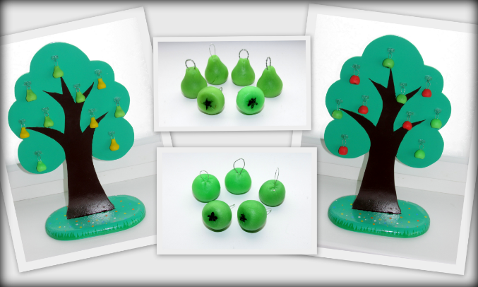 Пока налепленный урожай был на сушке приступили к дереву - нарисовала деревце на фанере, муж выпилил, отшлифовал,покрасил в зеленый цвет. Потом выпилил подставку под деревце и "грядки".Теперь можно было заняться "отделочными" работами)) Нарисовали ствол, веточки коричневой краской.На полянку под деревцем наклеили цветочки из самоклеящейся плёнки и травку, на грядку тоже, чтобы была немного повеселей)) На дерево термопистолетом приклеили крючочки, на которые нужно будет вешать фрукты.Когда овощи и фрукты досохли - приклеела на вишенки, морковку и свеклу листочки из фетра термоклеем.