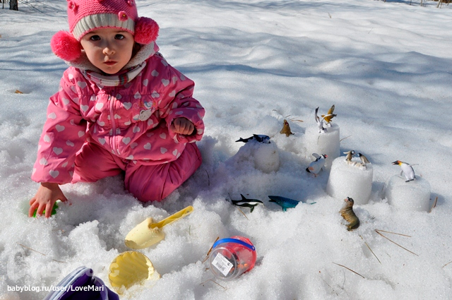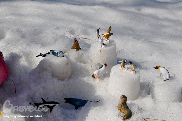 На следующий день решили устроить мини пикничек на уже облюбовавшемся месте. На белоснежном снегу я решила поиграть с Викой с животными антаркиды, заодно и закрепить нашу тематическую недельку.
