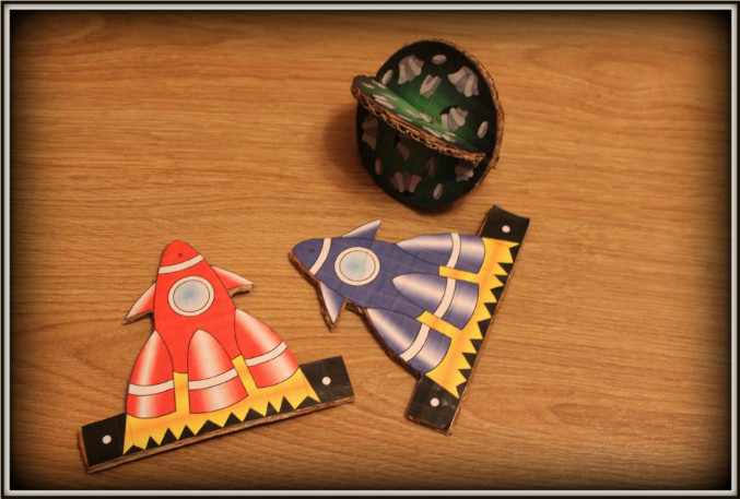 Ещё у нас в процессе изготовления комическая моталочка. Никак не можем доделать её. Смысл в том, что к каждой ракете прикрепляется пустой стержень и синтетическая нить, которая другим концом крепится к модели планеты. Нужно разойтись в разные стороны и крутить стержень как можно быстрее.Чья ракета быстрее долетит до цели, тот и победитель)) Отличное занятие для моторики и весёлая игра - 2 в 1))