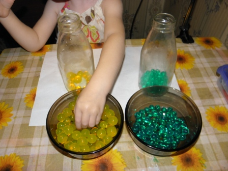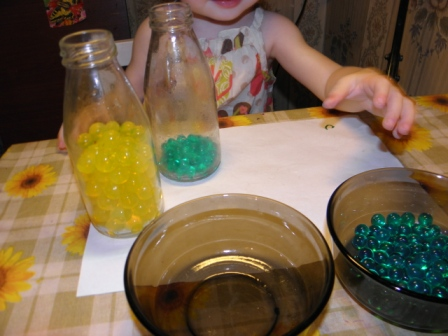 1) Сегодня утро начали с гидрогелевых шариков! одни получились большие другие поменьше Полине нужно сложить шарики в баночки! руками, они сколязят! Полинка пробовала сначала по одному , потом решила насырать 3 штуки сразу а она рассыпались! Стала в итоге желтые шарики по одному складывать!)