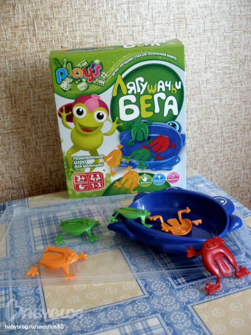 "Лягушачьи бега" - игра родом из детства. Продавались в 80-х гг в магазинах подобные лягушки-квакушки, только вроде не в наборах, а поштучно, и были они из довольно хрупкой пластмассы. Эти же лягушки сделаны из гибкой пластмассы, гладенькие и аккуратные. Лягушат 9 штук, по три каждого цвета. когда надоест попадать ими в цель - большую квакушку, можно устроить соревнование по прыжкам в длину, на скорость- чьи лягушки быстее прискачут к финишу. С ними хорошо играть в ванной, они у нас очень здорово прыгают с бортиков.
