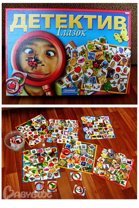 "Детектив"- игра на развитие памяти, внимания, реакции, в настоящий момент одна из самых любимых у старшей дочки. Игра состоит из шести прочных карт из плотного картона с изображением разных предметов, и 90 двусторонних карточек, на которых изображены части этих предметов, а также песочных часов. Правила есть по ссылке. Изначально я, опасаясь как бы Марьяна не испортила маленькие карточки, спрятала их, и мы просто все дружно загадывали друг другу и находили предметы на больших картах, причем младшая очень удивила меня своим кругозором. Со старшей искали предметы на определенную букву, младшую прошу найти всех птиц, или все съедобное и т.д. Месяца два назад я достала маленькие карточки и песочные часы, и мы стали играть со старшей по правилам. Младшая, пока ей не давали маленькие карточки, истошно вопила, пытаясь схватить и отобрать желаемое, причем во время нашей игры. Приходилось мужу ее отвлекать, но как только я сама с ней поиграла, почти по правилам, в отсутствие Карины, интерес к отбиранию у нее уменьшился, и мы уже можем более-менее спокойно поиграть со старшей, когда младшая рядом.