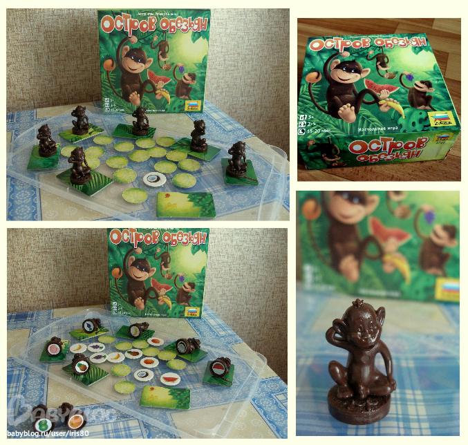 "Остров обезьян"- игра на развитие памяти. Похожа на мемори, но чуть посложнее в силу того, что обезьянки после каждого хода перемещаются на освободившуюся подставку-лиану, которых в игре на одну больше, чем обезьян. Всего обезьянок восемь, но можно играть хоть с тремя, постепенно добавляя обезьян, тем самым постоянно усложняя игру. Мы играем обычно с 6 обезьянками, а парочку отдаем младшей для самостоятельной игры.