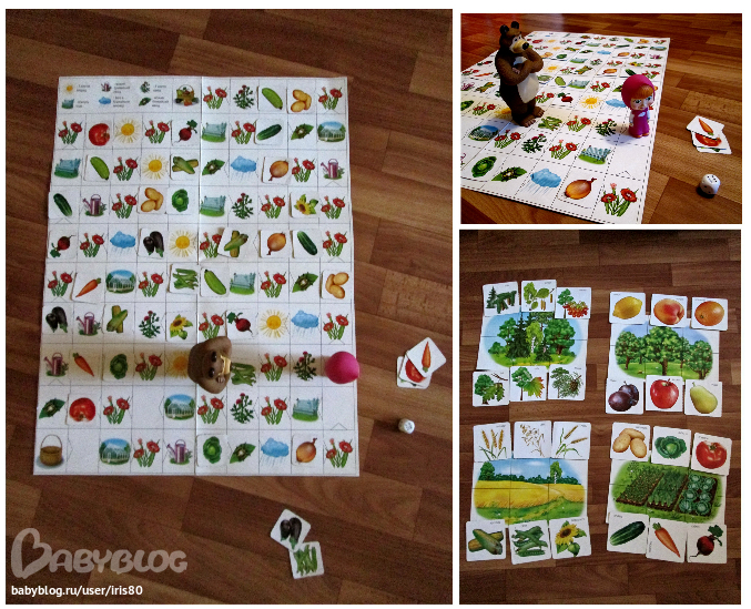 В комплекте две игры: лото, расчитанное на деток от двух лет, и игра-ходилка. Два плюса у ходилки в том, что во-первых - побеждает не тот, кто первый дошел до финиша, как в большинстве подобных игр, а тот, кто собрал больше овощей, и второе - в этой игре довольно крупные клетки, и можно играть не обычными фишками, а любыми фигурками, которые есть в наличии. Мы играли и игрушками из киндер-сюрпризов, и фигурками из наборов с персонажами сказочных героев, то есть игра каждый раз приобретает новизну. В ходилку стали играть, когда дочке исполнилось 3,5-4 года. Тогда она как раз осваивала счет, и с огромной радостью подсчитывала собранные овощи))