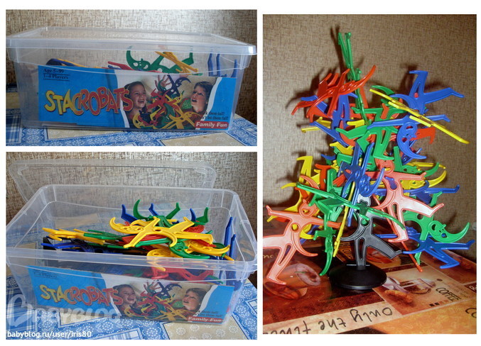 "Акробаты" - эту игру я попросту нашла на улице)) Пошли мы как-то с детьми в гости к бабушке, и возле ее дома, у соседнего подъезда я увидела яркую коробку. Сразу поняла, что это игра, и скорей ринулась рассмотреть ее поближе, совершенно не предполагая, что она окажется не пустая)) Скорее всего ее кто-то попросту потерял, но так как со слов мамы коробка лежала у подъезда уже не первый день, то я не стала долго думать на тему "взять ли ее себе". Решила, что она будет мне компенсацией за потерянную дисконтную карту, которую мне никак не хотели восстанавливать в одном из супермаркетов хотя должны были по их правилам. Моя коробочка была явно не фирмы Ravensburger (ниже картинка с интернета), но качество человечков-акробатов было очень хорошим. В дальнейшем они просто поселились в пластиковом контейнере. Игра развивает ловкость рук, да и мышлению-соображению помогает, так как желательно подумать, куда прицепить очередного акробата, чтобы не разрушилась вся конструкция. В эту игру можно играть как одному, так и с соперниками.