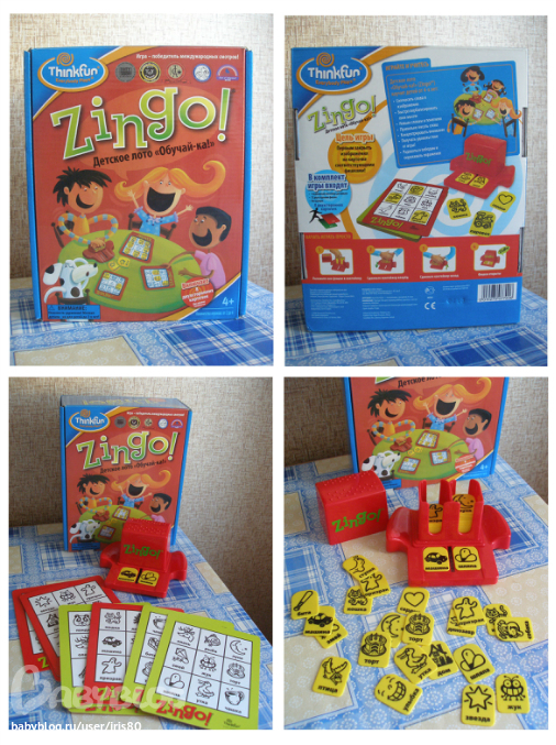 Лото "Джинго"- купила в местном супермаркете полтора года назад. Понравилось то, что большие карточки прочные, а маленькие так вообще пластмассовые(и гладенькие-гладенькие - я чуть не медитирую, когда держу их в руках))). Игра на внимание и реакцию. Рисунки на больших картах частично повторяются, так что фишку получает тот игрок , кто перый заметит свою картинку на вновь открывшихся фишках.