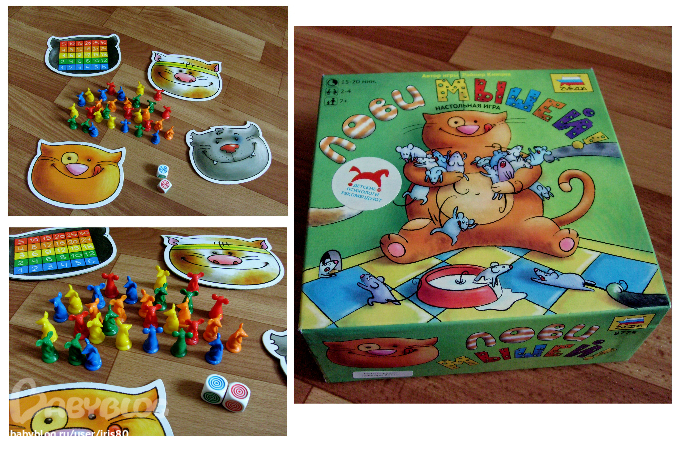"Лови мышей"- веселая азартная игра. Фигуркам мышей из этой игры мы нашли уже столько применений, что им будет посвящен отдельный пост! Что же касается правил этой игры, то на первый взгляд они кажутся сложными(судя по инструкции), но как только хоть один человек разберется, то своими словами правила можно объяснить за пару минут. В общем, написано только мудрено. Если совсем кратко, то: "кидаем кубики, и приманиваем мышей соответствующего цвета". Во время каждого хода игрок может бросить кубики несколько раз, дабы приманить большее количество мышей, но может потерять и всех своих мышей, если на кубиках выпадет определенная комбинация; также можно воровать мышей у соперников. В общем, нюансов довольно много. В эту игру можно играть по обычным и упрощенным правилам. В первом случае мышь определенного цвета имеет свой номинал, от 1 до 5, во втором - просто подсчитываем количество мышей в конце игры. Пока мы играем по второму варианту. Мыши - просто чудо)))