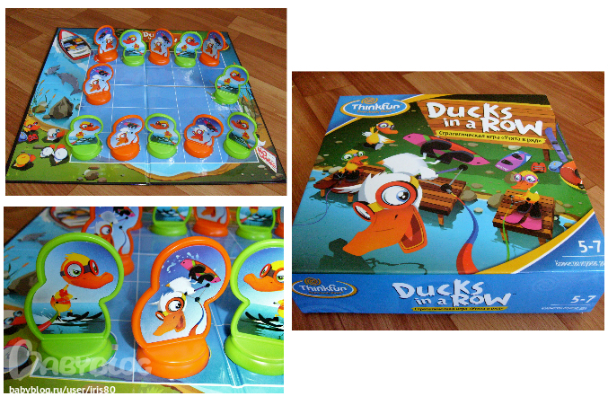 "Утята в ряд"- игра на развитие логического мышления, для меня - замечательный вариант в качестве подготовки к шашкам и шахматам. Игра расчитана на деток от пяти лет. Подарила дочке на НГ, правила очень простые(выстроить четырех утят своего цвета в ряд по горизонтали, вертикали , или диагонали), но сначала дочь правил не поняла. Объяснил восъмилетний сын подруги))