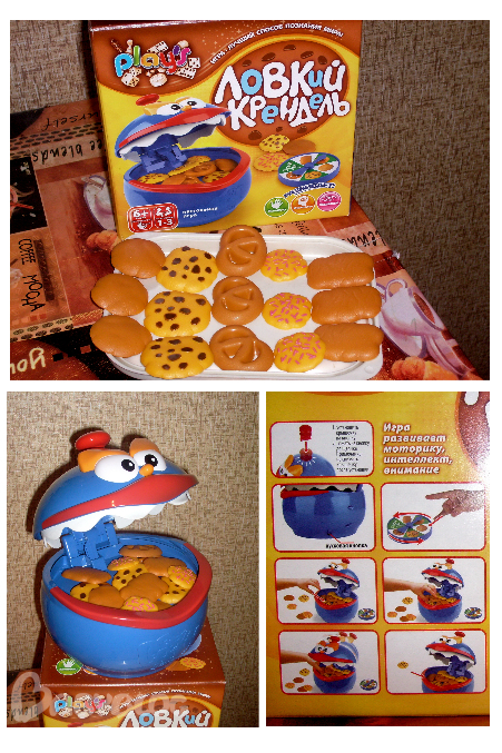 "Ловкий крендель". Увидела эту игру в местном магазине, потом заказала в "Лабиринте". При получении была несколько разочарована цветом горшочка - не таким ярким, как на коробке, но во всем остальном покупкой осталась довольна. Игра механическая, без батареек, прежде всего на ловкость. Игроки по очереди достают из горшка печенье. Неаккуратное движение - и горшок захлапывается. Тот игрок, собственно, и считается проигравшим. Игрушка из пластмассы, в том числе и крендели-печеньки. Дочки играли ими и в дом, и в магазин, но потом я убрала горшок повыше, так как надоело разыскивать сии хлебобулочные изделия во всех наших многочисленных сумочках, авоськах и корзинках)))