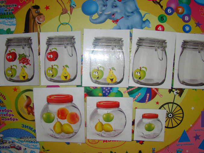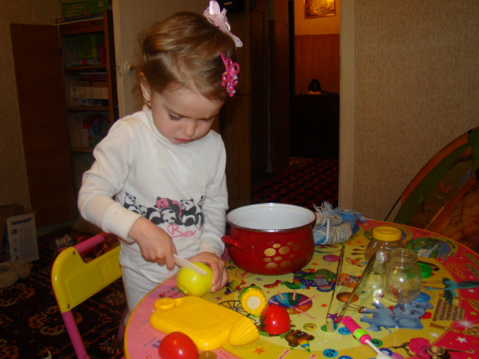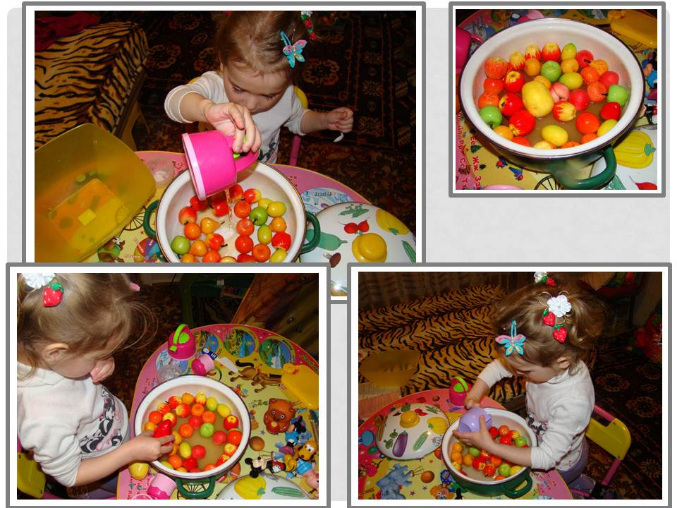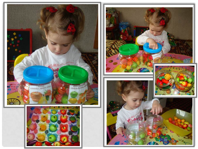 7. Еще была такая игра на сортировку: варили варенье из имеющихся у нас фруктов и ягод (мандарины, яблоки, груши, клубника, лимоны, персики). В соответствии с этикеткой раскладывали по баночкам фрукты. А потом поменяла банки местами – проверка на внимание – тоже разложила все правильно. А потом уже вечером перед сном стала рассказывать мне, какие фрукты должны лежать в одной баночке, а какие - в другой (надо же, запомнила).