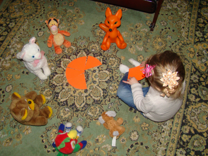 А потом, конечно, угощаем Дашиных детей супом ( на этот раз был мишка). Мишка у нас ест неаккуратно, поэтому после еды вытираем его носовым платком (заодно выполняем маленькое задание – какие формы можно получить из квадратного платочка – треугольник (большой и маленький), прямоугольник (большой и маленький). Дашу очень веселят эти превращения).