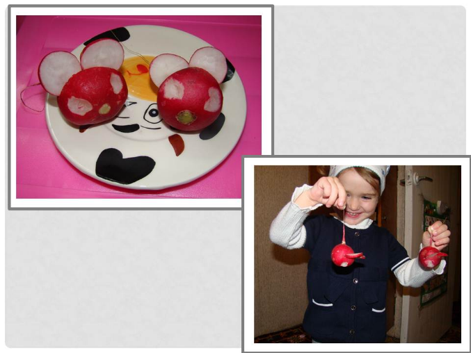 Мышки из редисок делала я сама. Правда, я в таких вещах ДАЛЕКО НЕ профессионал, поэтому мышки получились малость кривоваты. Ну да ладно, Дашу они впечатлили.
