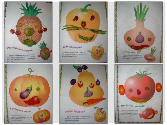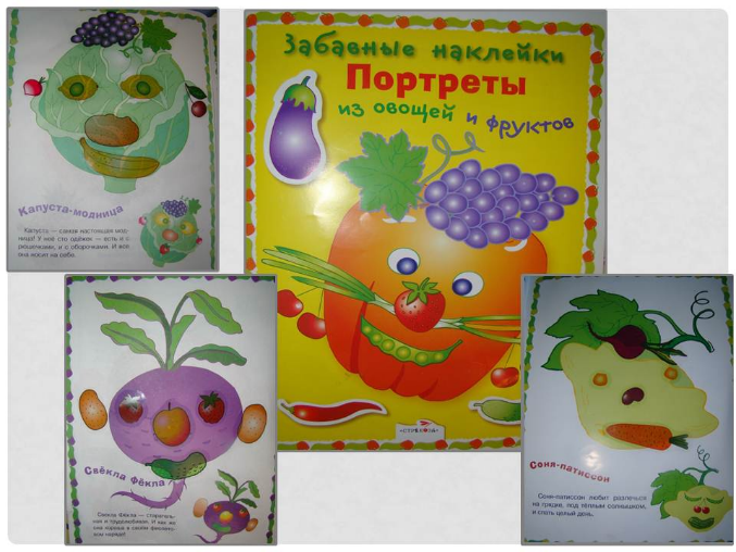 1.В первую очередь хочу рассказать об одной книжечке, называется «Забавные наклейки. Портреты из овощей и фруктов», наткнулась на нее случайно в книжном магазине и очень она нам понравилась обеим. В ней при помощи овощей и фруктов можно сделать забавные мордашки, очень понравилось также, что есть шаблоны.