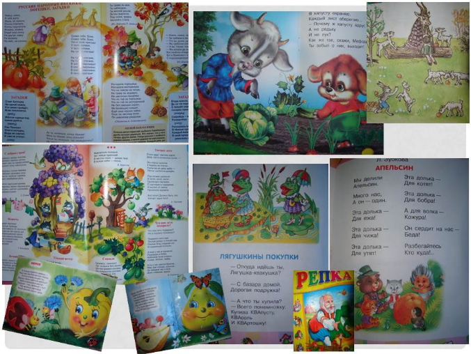 1.Книги: Мешок яблок, Репка, Мы делили апельсин, Стихи для малышей «Во саду ли, в огороде» , разные стишки из сборников.