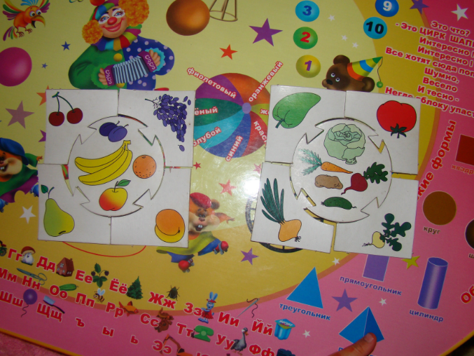 1.Раскладывали фрукты и овощи по карточкам, а еще по нарезке определяли, что это за фрукт или овощ – справилась отлично! Пыталась поиграть с ней в игру из моего детства «Закрой глаза, открой рот» и угадай, что за фрукт, но Даша смысла не поняла, поэтому игра быстро закончилась ))