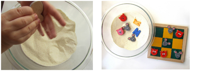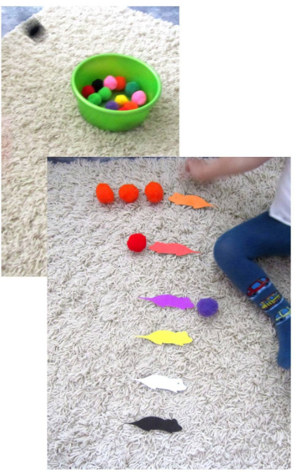 Помпошки для сына это новая игра, поэтому с ними игры затянулись. Сын выкладывал их в ряд, сказал что это змея, потом она ловила наших мышек, мышки убегали в норки. Делали из помпонов цветы. Потом снова бросали их в чашку.