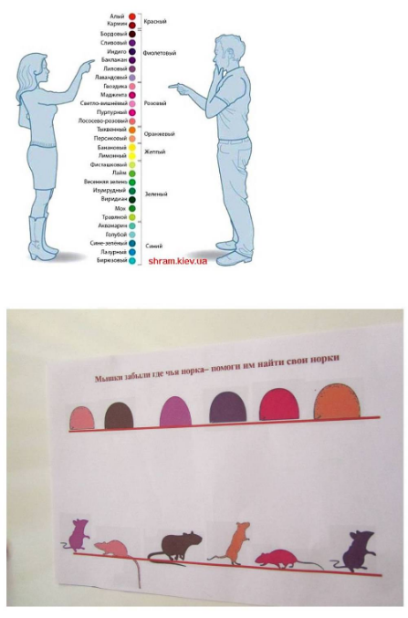 Всем известный факт, что у мужчин проблемы с оттенками цвета, если специально не расширять визуальную палитру. По-этому решила я включать иногда задания на оттенки цвета, чтобы сын отличал лиловый от розового, салатовый от бирюзового.