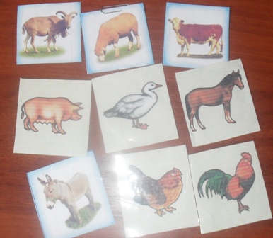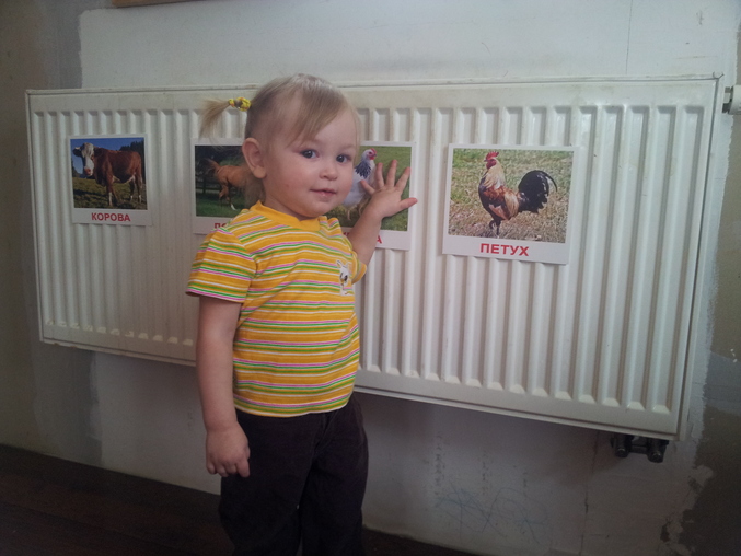Карточки такие я сначала думала напечатать,но увидела в детском универмаге по тематикам продавались,вот и купила как раз домашних живтных. Я их развесила на первом этаже в нашей игровой. И каждый день по- немногу мы с Алисиком изучали. Сначала я ей показывала,она послушает и пойдут дальше,потом я уже у нее спрашивала "где петух?", "как петух делает?" и она показывала и изображала. А теперь стимулирую,чтобы она начала говорить,..показываю пальцем и спрашиваю: "кто это?" но у Лисены все аф-аф,му..и прочее))хотя никогда мы не упрощали,а называли все своими именами. Итог с карточками поразителен-все очень быстро и ненавязчиво запоминается